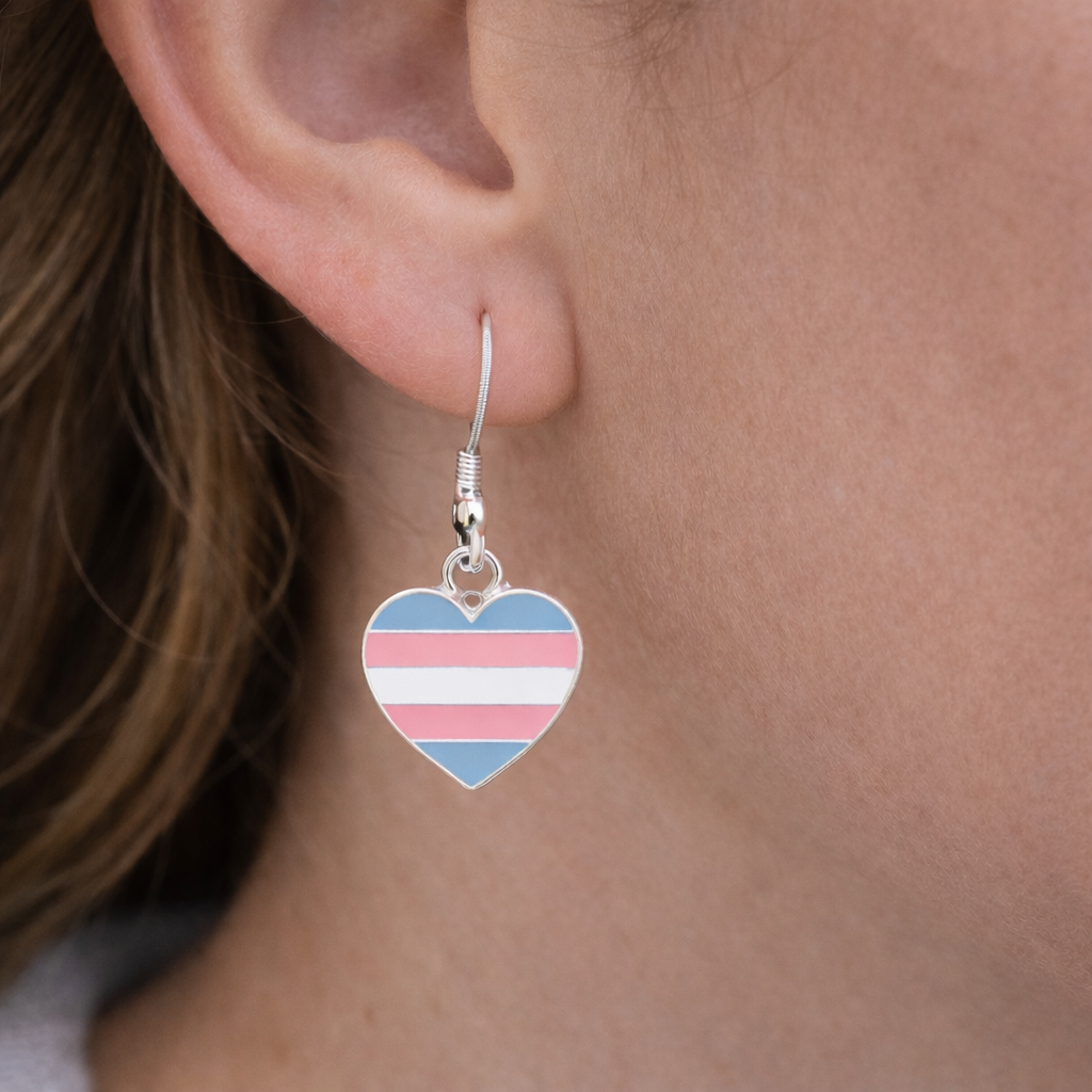 Celebrate pride and identity with these beautiful transgender heart hanging earrings. Featuring vibrant pink, white, and blue enamel stripes in the iconic transgender pride flag design, each heart-shaped charm is elegantly framed in a polished silver-tone setting. The charms dangle gracefully from silver-plated ear wires, creating a lightweight and comfortable accessory perfect for everyday wear, Pride events, advocacy gatherings, or meaningful gifts.