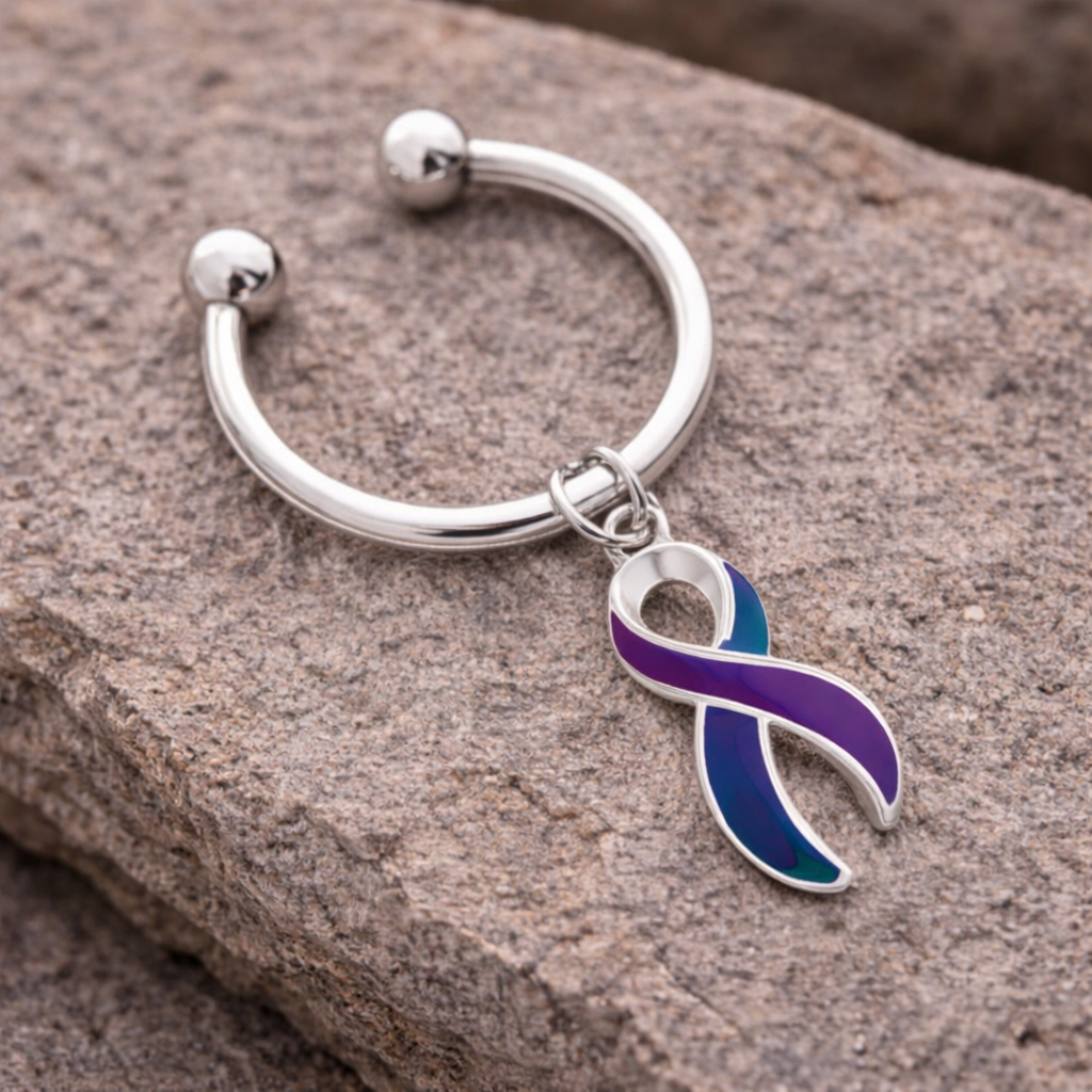 Teal & Purple Ribbon Awareness Keychain – Sterling Silver Plated Support Key Ring